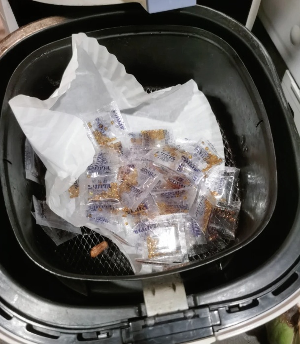 只需要把干燥剂放在空气炸锅中,200度3~5分钟,你的干燥剂就能重新使用了,是不是超级香呢。简直就是无限循环的好东西!