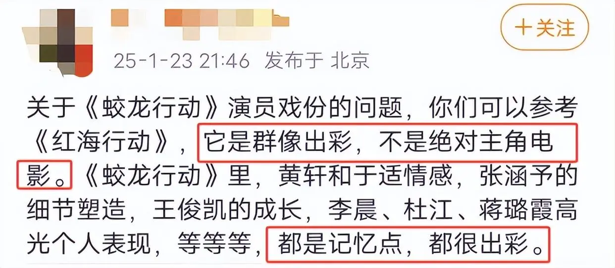 但是这一次,《蛟龙行动》做到了,看过电影的人都在反馈,这部电影是一部真正的群像电影,电影里的每一个人都有属于自己的高光时刻,黄轩、张涵予、于适、蒋璐霞、杜江、李晨,王俊凯……看完电影后,你能记住他们每一个人在电影里的精彩表现,而不会因为某一个人太过耀眼,致使别的战士沦为工具人、背景板。